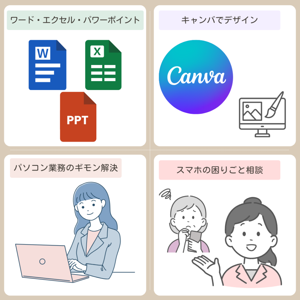 Canva(キャンバ)の使い方、年賀状、家計簿、カレンダー作り、スマホカメラの使いかた、MOS資格取得、オンライン会議、フォトブック作成 など多数