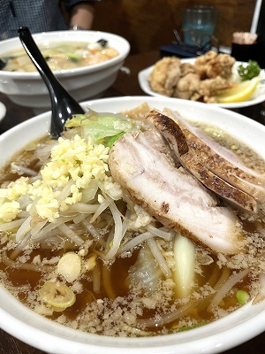 たっぷりチャーシューにもやし、浮かぶ背油に刻みニンニク入りの一杯を、落ち着く空間でゆっくり食べられ大満足でした。