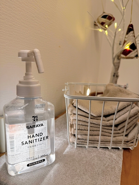 アルコールと、水滴を拭いていただけるようタオルを入口に備えています。