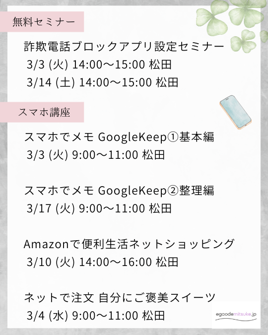 - 詐欺電話ブロックアプリ設定セミナー 3/3 (火) 14:00~15:00 、3/14 (土) 14:00~15:00 松田
