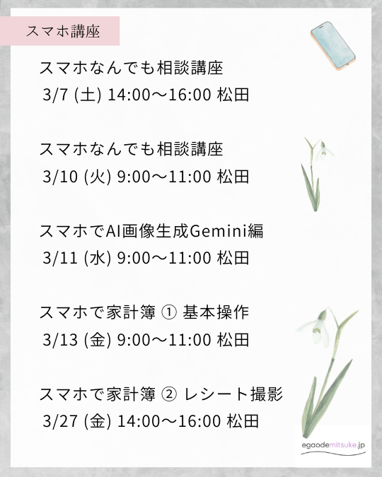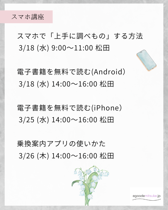 - スマホなんでも相談講座 3/10 (火) 9:00~11:00 松田